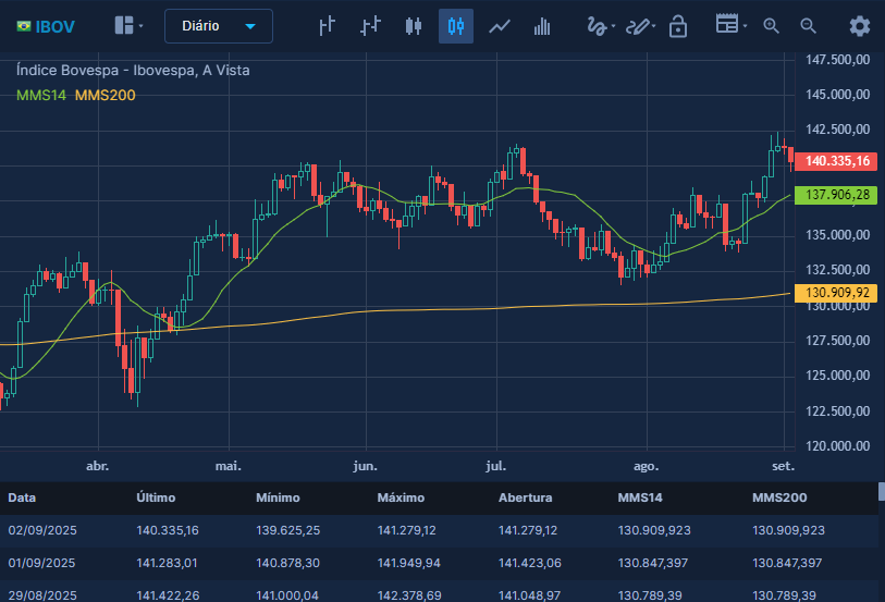 Gráficos com séries diárias e intradiárias, diversos estudos, traçados e indicadores para monitorar o preço dos ativos.