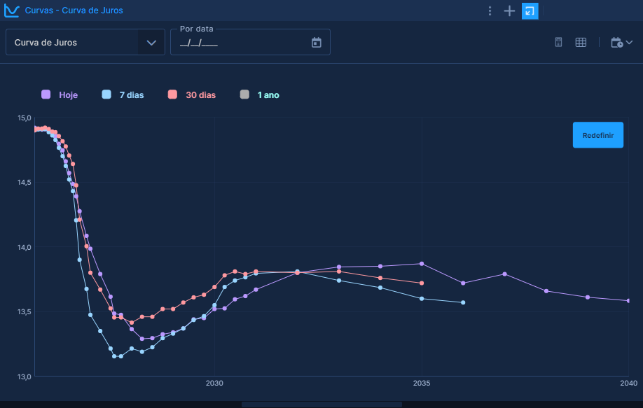 Representação gráfica das taxas de juros futuras negociadas na B3, projetando a visão dos investidores para os próximos anos e possibilitando o contraste com curvas de períodos anteriores.