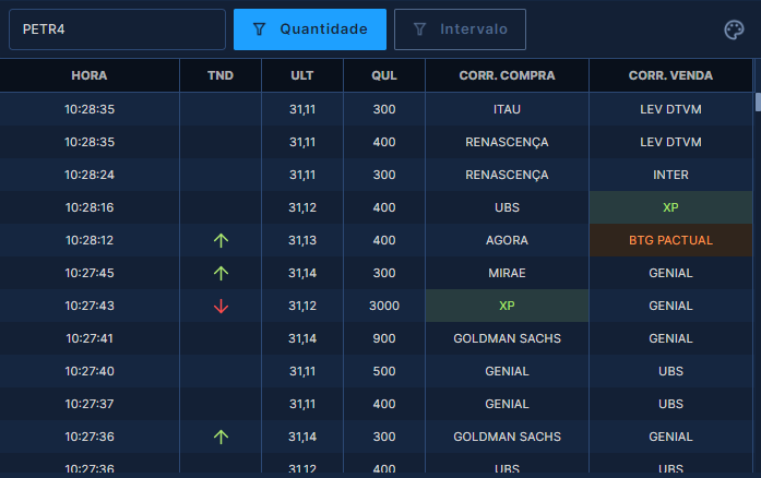 Funcionalidade que traz negócio a negócio realizado por um ativo, com possibilidade de sinalização de cor por corretora e filtro de exibição por quantidade.