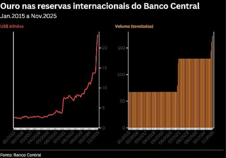 A visão de Pinese é corroborada pelo economista Pedro Moreira, sócio da ONE Investimentos. Ele afirma que a compra recente alinha o BC brasileiro a outros pelo mundo na busca por reduzir a exposição a títulos da dívida americana e aumentar a alocação em ouro.