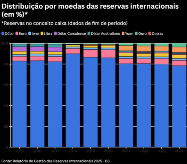O dólar segue como o principal ativo das reservas brasileiras, mas sua representatividade diminuiu nos últimos anos: passou de 86,77% em 2019 para 78,45% em 2024.