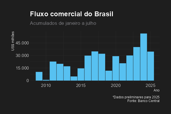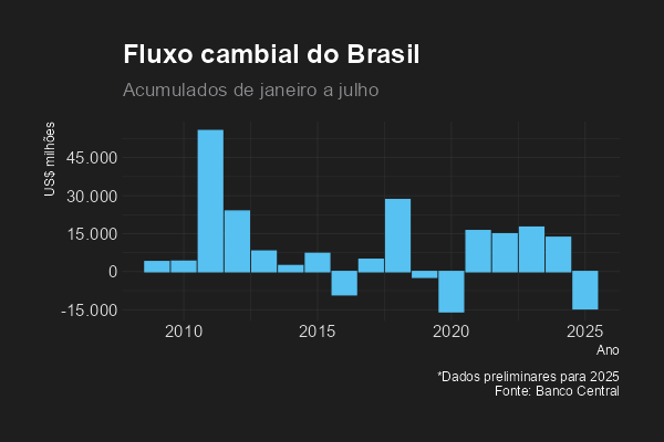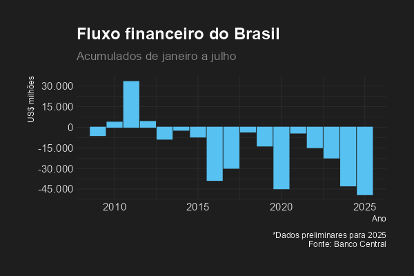 Considerando só o canal financeiro, o saldo de 2025 é o mais negativo da série histórica, com saída líquida de US$ 49,064 bilhões. A saída, é 9,63% maior do que o fluxo negativo de US$ 44,752 bilhões de janeiro a julho de 2020, que até agora era a maior da série histórica, iniciada em 2008.