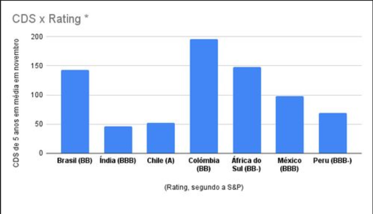 Na Colômbia, por outro lado, o rating definido pela S&P é igual ao do Brasil (BB), mas o CDS de 5 anos do país foi consideravelmente mais elevado, de 196,2 pontos em novembro. A comparação com a Colômbia já foi, inclusive, citada pelo secretário do Tesouro, Rogério Ceron, ao defender a volta do grau de investimento ao Brasil.
